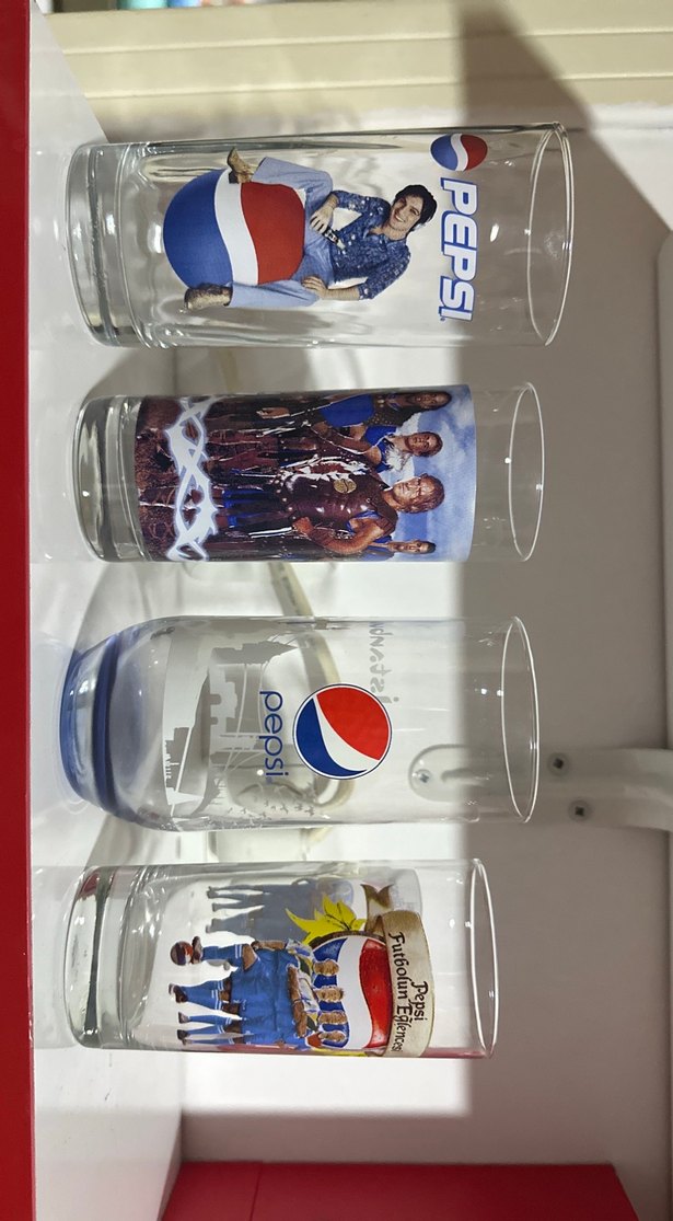 Farklı Pepsi temalı tasarımlarla renkli bardak seti. Her bardakta mavi ve canlı renklerde nostaljik Pepsi görselleri bulunur. Adet fiyatı 75 tl