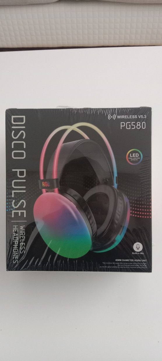 PG580 Disco Pulse kablosuz kulaklıklar, renkli LED ışıklar ve dahili mikrofon ile gelir. Bluetooth 5.3 ile bağlanır, 40 mm sürücüler net ses sağlar.