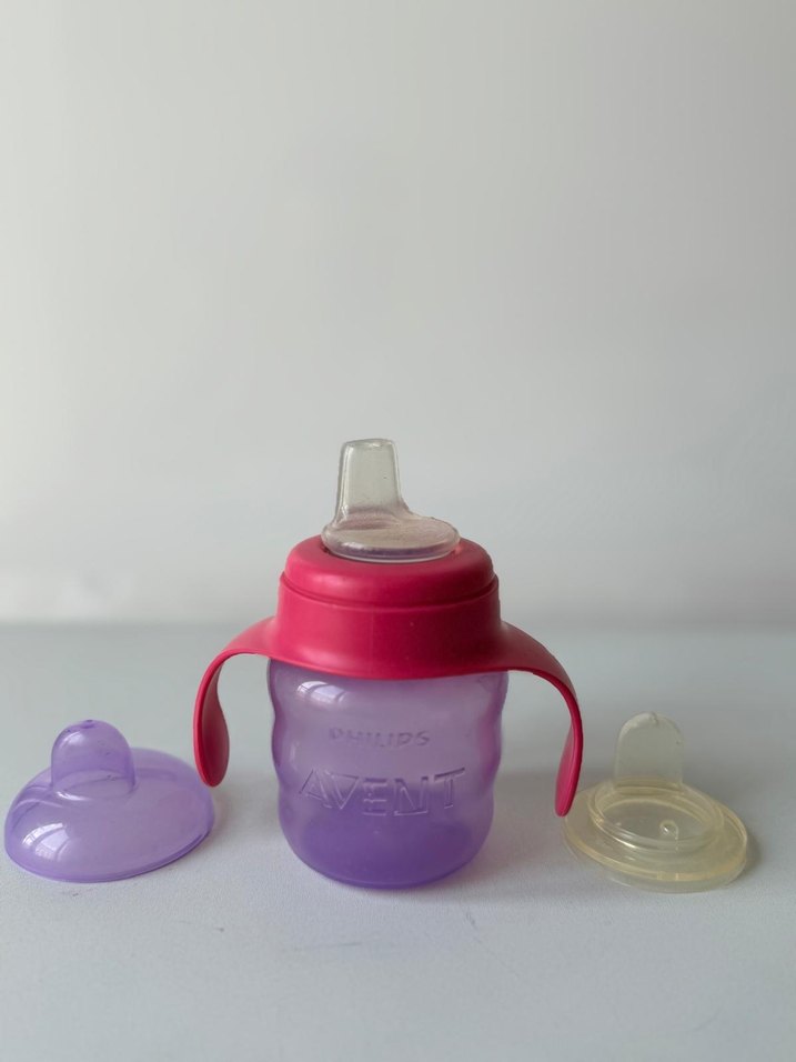 Renkli Philips Avent bebek biberonu, pembe kulplu ve mor gövdeli, kolay tutuşlu kulplara ve farklı emzik seçeneklerine sahiptir.