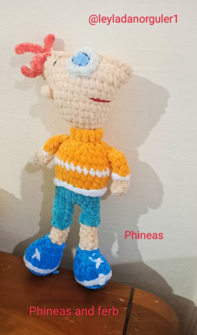 Yumuşak dokulu, renkli Phineas peluş oyuncak. Turuncu üst ve mavi ayakkabıları bulunur. Kadife ip ile örülmüş amigurumi çizgi film karakteri Phineas.