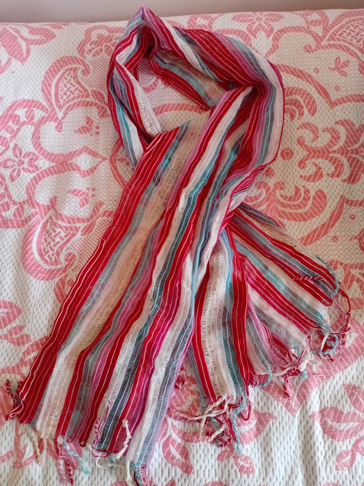 Renkli çizgili, pileli tekstil kumaştan yapılmış kadın fuları. Bohem, hippie ve retro tarzlara uyum sağlar. Bayan şal 5 adet ve son resimdeki çanta hediyedir.