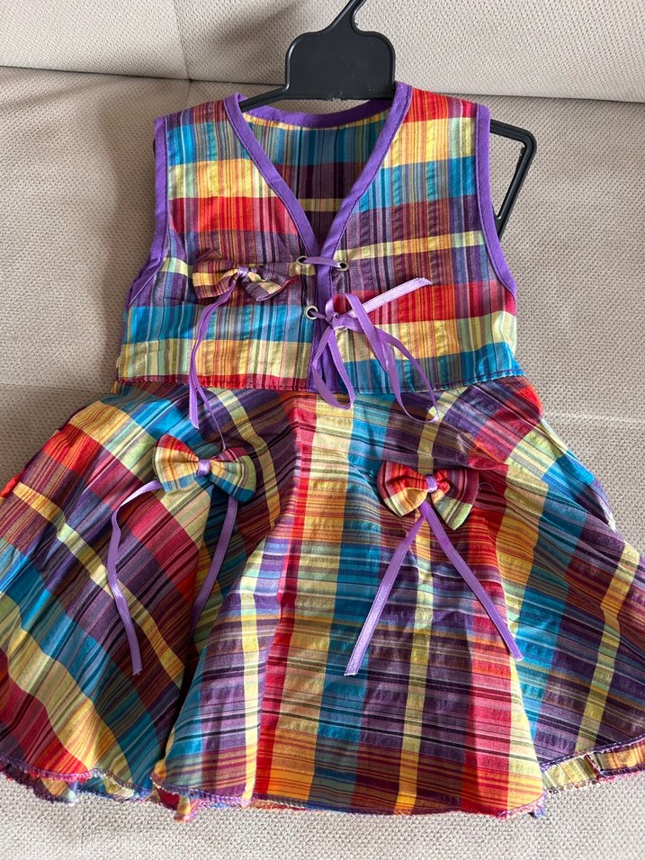 Renkli ve pileli kız çocuk elbisesi, bol kesim ve halter yakaya sahiptir. Yumuşak kumaştan yapılmış, canlı batik desenli ve askılı kolludur.