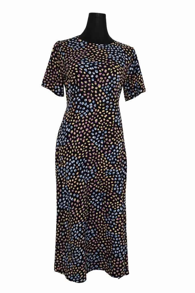 Renkli pileli uzun elbise, kısa kollu ve yuvarlak yakalıdır. Sentetik kumaştan yapılmış, bol kesimdir ve günlük kullanıma uygundur.