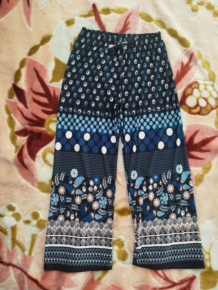 Renkli tie-dye desenli, uzun ve bol kesim kadın kumaş pantolon, pilili detaylara sahip, sentetik kumaştan günlük kullanım için uygun.