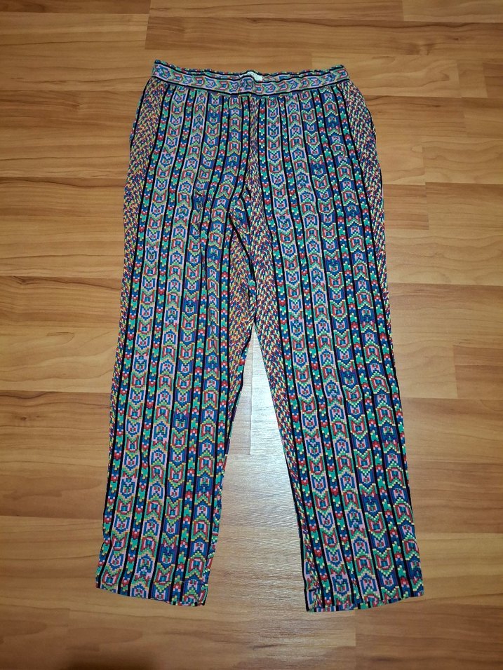 Renkli, pilili ve bol kesim kadın pantolon. Sentetik kumaştan, bohem tie-dye desenli, günlük kullanıma uygun rahat bir model. defo yoktur, iade yoktur!