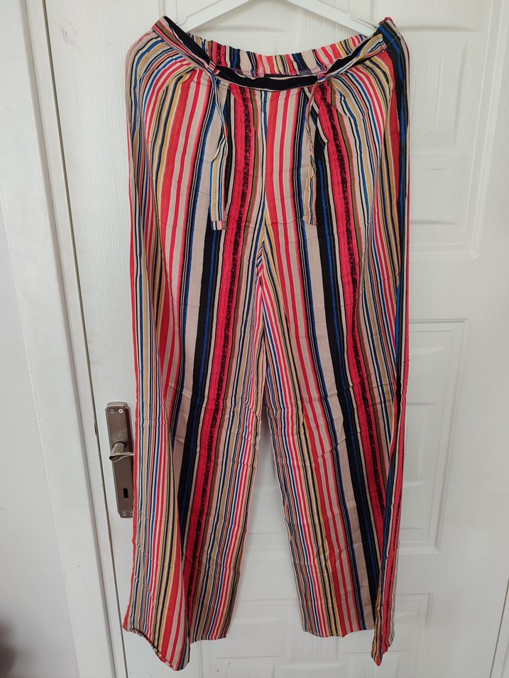Renkli dikey çizgiler ve pililerle tasarlanmış, bol kesim uzun kadın pantolonu, yumuşak sentetik kumaştan, bohem tarzında.