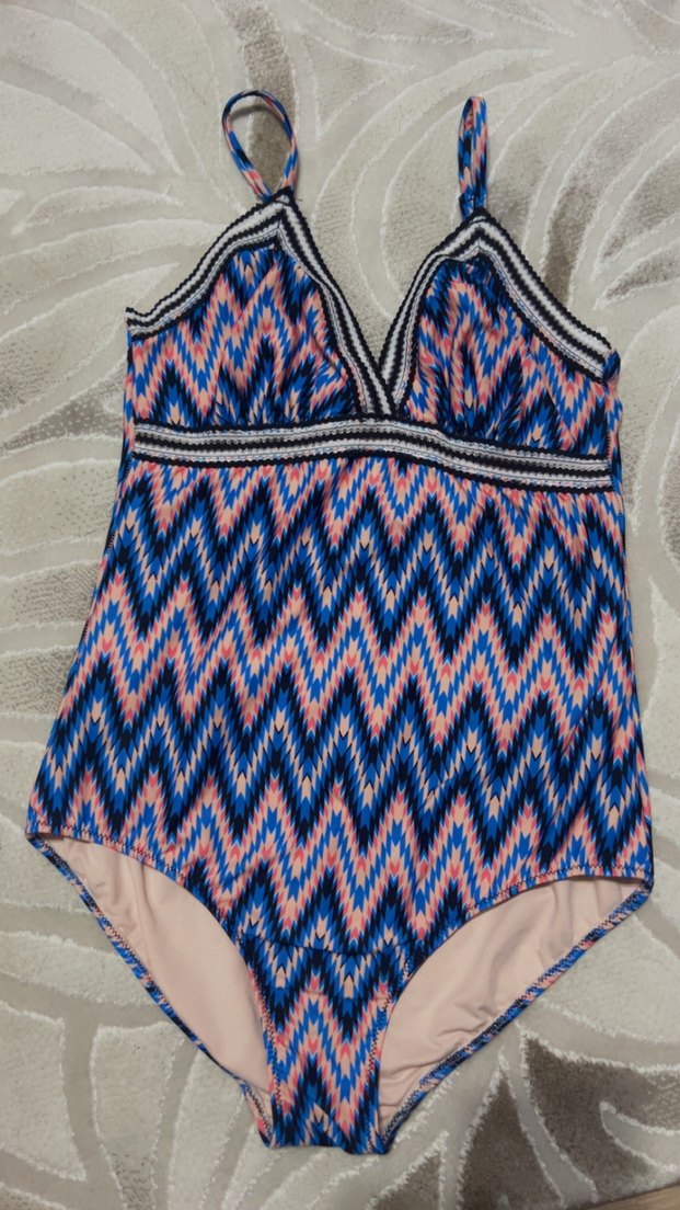 Renkli pilili ve bağcıklı askılı, bohem tarzda, vücuda oturan ve tie-dye desenli kadın mayo.
