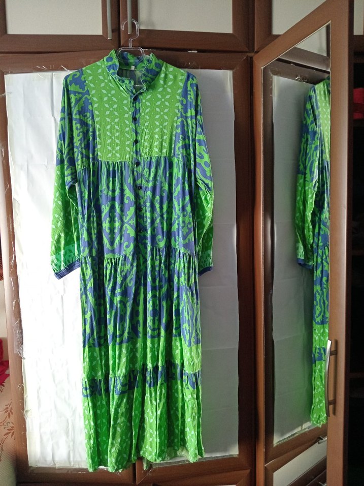Renkli batik desenli bohem uzun elbise, pilili detaylara sahip. Uzun kollu, yüksek yakalı ve bol kesim, yumuşak tekstil kumaştan yapılmıştır.