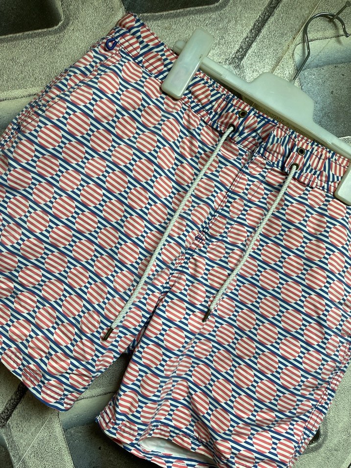 Renkli, pilili ve dar kesim erkek mini mayo, sokak stiline uygun, plaj için ideal kısa boyda.