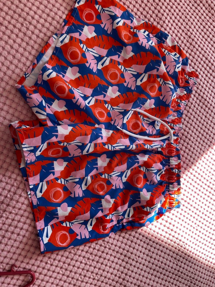 Renkli, pilili ve bol kesim erkek mayo şortları, canlı tie-dye pop kültür desenine sahip. Bohem ve retro tarzıyla günlük kullanıma uygundur.
