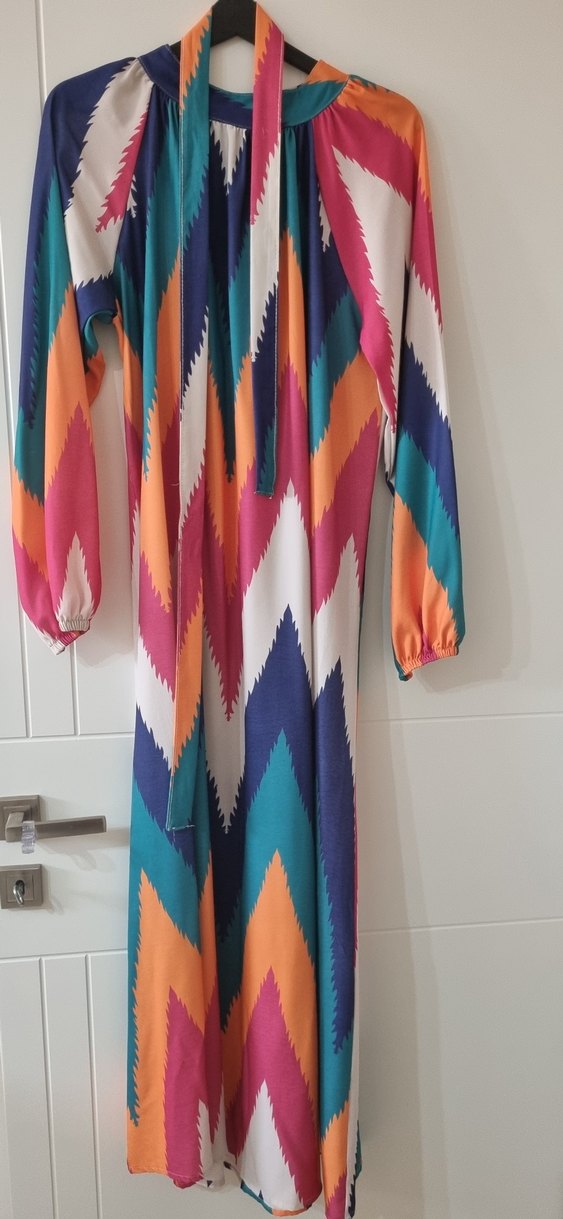 Renkli pilili uzun bohem elbise, uzun kollu ve V yaka detaylıdır. Rahat kesim ve canlı tie-dye desenlere sahiptir, yumuşak sentetik kumaştan üretilmiştir. boy 139 kol altı 53 kol boyu 52 krep gibi kumaşı