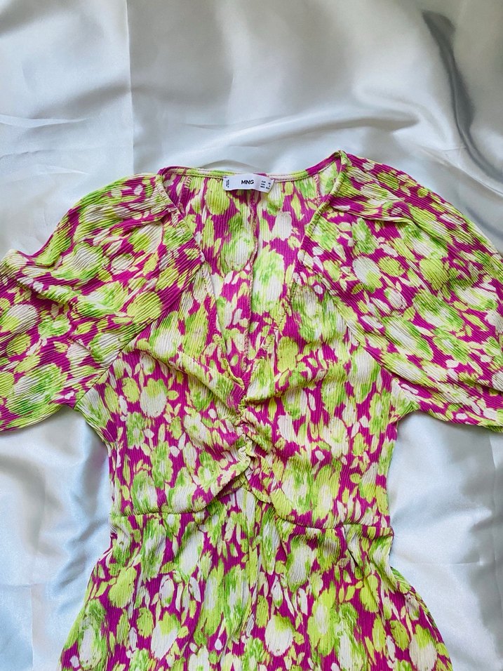 Renkli, pilili ve V yakalı hamile bluzu. Kısa kollu, yumuşak sentetik kumaştan, bol kesim ve uzun boyda, günlük kullanım için uygun.