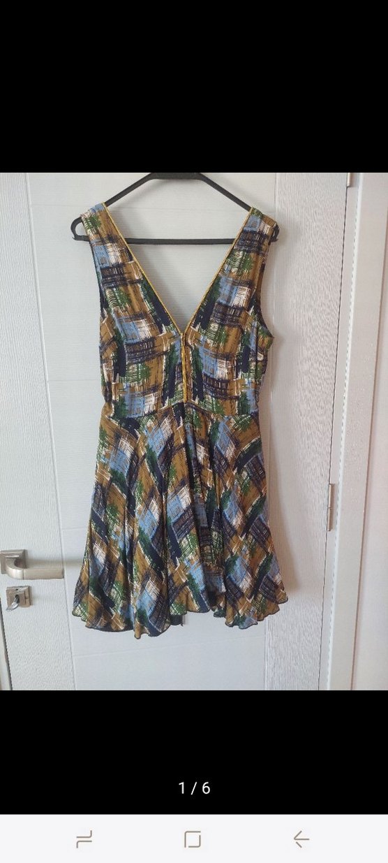 Kolsuz, V yaka, bol kesim pilili kısa boy bohem elbise. Sentetik kumaştan, koyu renkli çok renkli batik desenlidir.