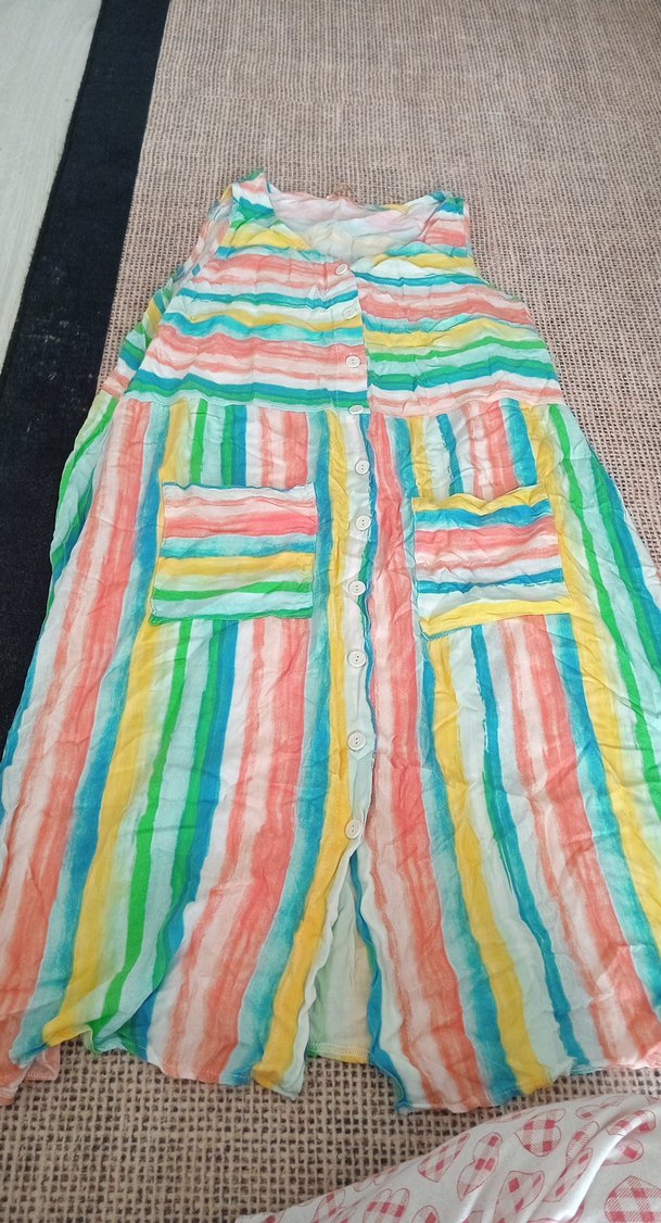 Kadın elbise, straplez yaka ve kolsuz tasarıma sahiptir. Uzun boyda, piliseli tekstil kumaşında pastel tonlarda batik desenlidir, bohem tarz için uygundur.