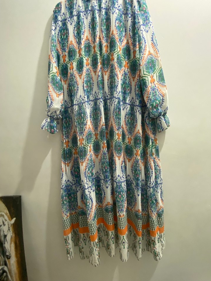 Renkli piliseli detaylara ve yüksek yakaya sahip uzun bohem elbise. Uzun kollu, bol kesim ve yumuşak sentetik kumaştan yapılmıştır. Canlı batik desenlidir.