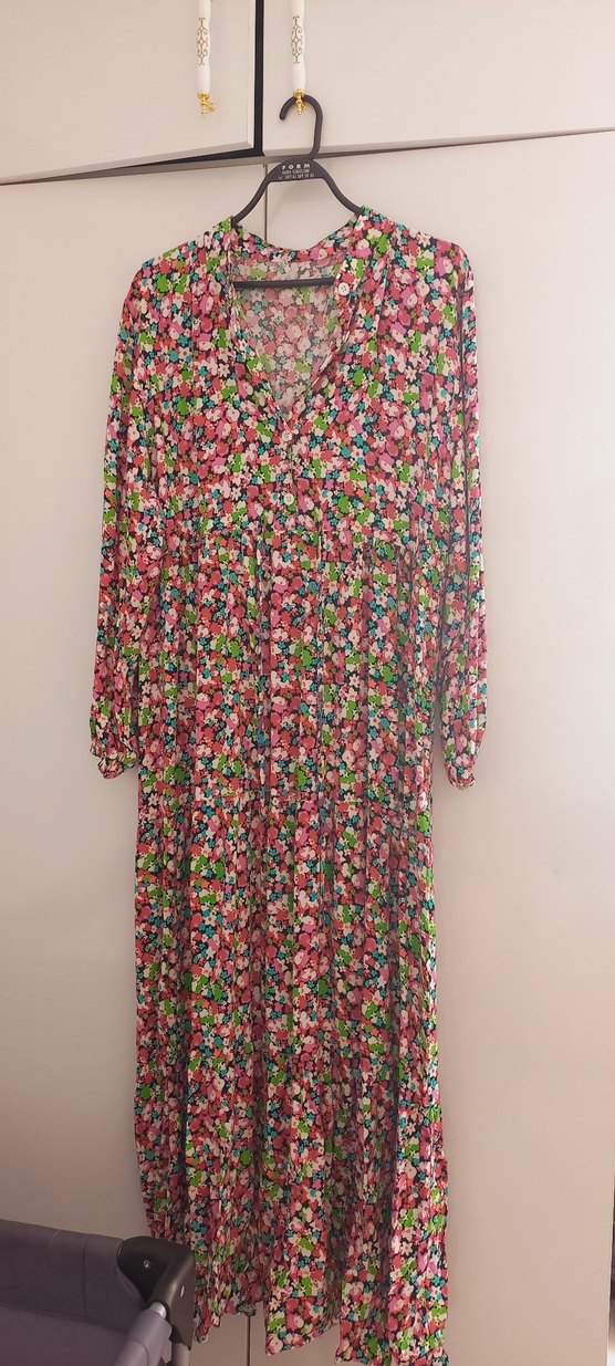 Renkli uzun elbise, bol kesim, piliseli detaylar ve V yakaya sahip. Yumuşak sentetik kumaştan, uzun kollu, canlı çiçek desenli bohem tarzda. Uzun elbise arayıp bulamayanlar için hem uzun hem büyük beden boy uzunluğu 150 cm beden 48 bedene oluyor ben aldım yıkadım ama kullanmadım öylece duruyor