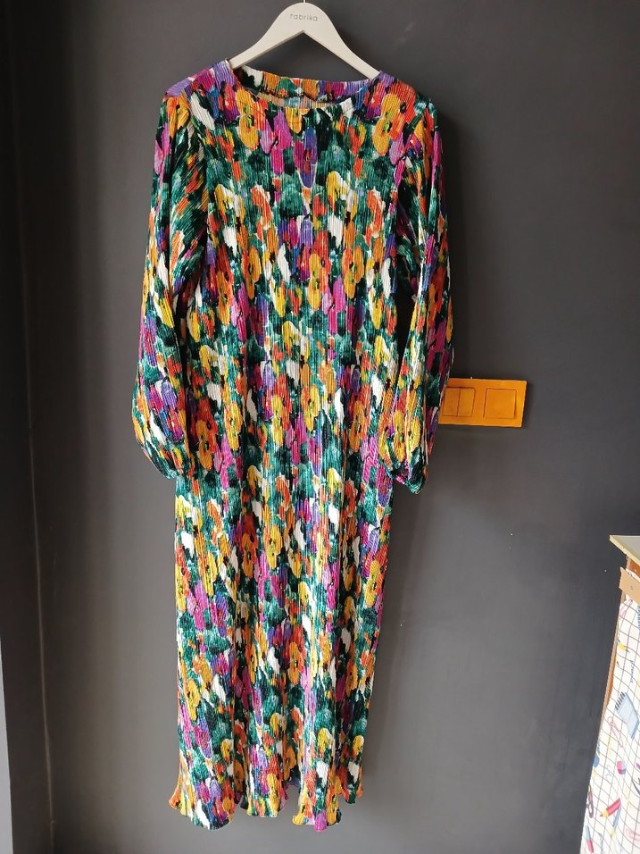 Renkli piliseli uzun elbise, bol kesim ve uzun kollu. Sentetik kumaştan, bohem tarzda, yuvarlak yakalı ve batik desenlidir.