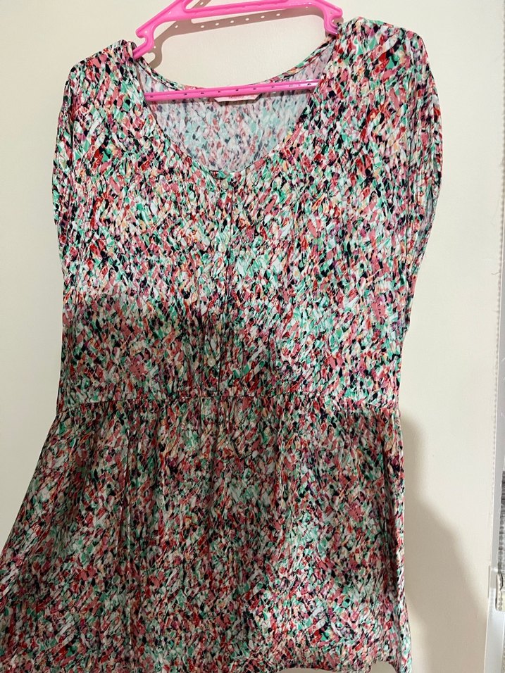 Kolsuz, renkli tie-dye desenli, V yakalı ve piliseli uzun kadın elbisesi. Sentetik kumaştan, bol kesimli ve bohem tarzda, günlük kullanıma uygun.