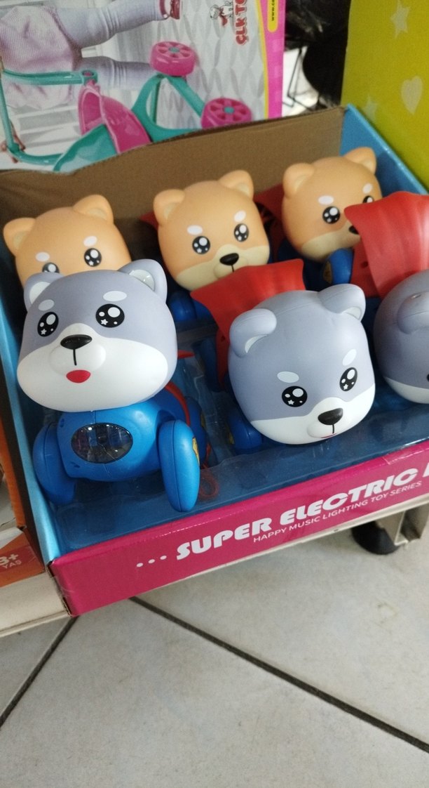 Sevimli yüzlü, tekerlekli renkli elektrikli ayıcık oyuncaklar. Ambalajda 'SUPER.ELEOTRIO' yazısı bulunur.