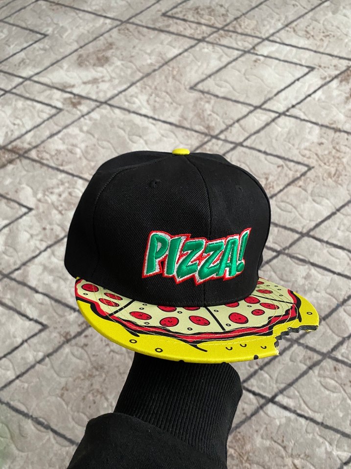 Erkekler için renkli pizza dilimi baskılı ve "PIZZA!" nakışlı sokak tarzı şapka, grunge punk havası için ideal.