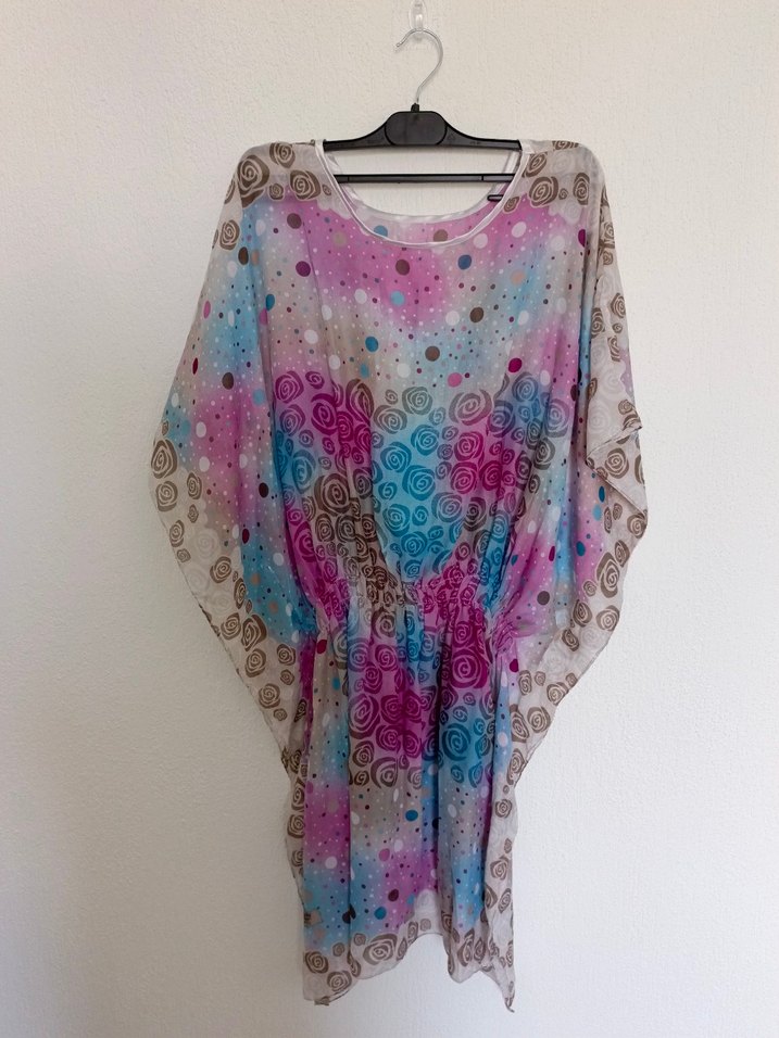 Bol kesim, Kısa kollu,yumuşak sentetik kumaş,plaj kıyafeti.son resimde elimle gösterdiğim gibi bazı yerlerinde takılmalar olmuş ama ürün çok renkli olduğu için farkedilmiyor.