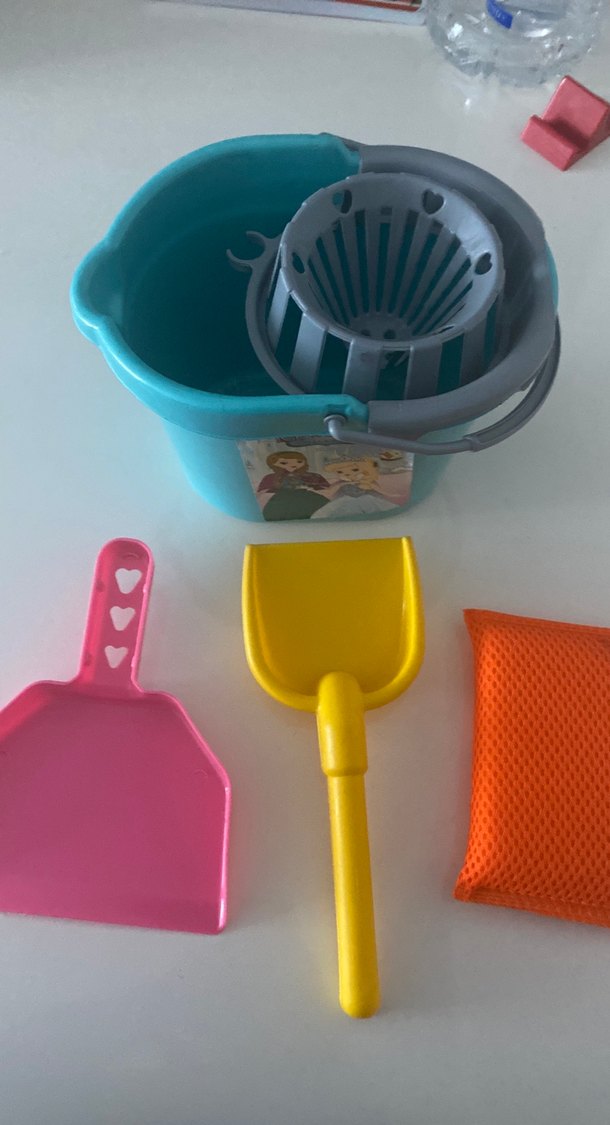 Mavi kovası, gri sıkma aparatı, pembe kepçe, sarı kürek ve turuncu fileden oluşan renkli plaj ve bahçe oyuncak seti. ️