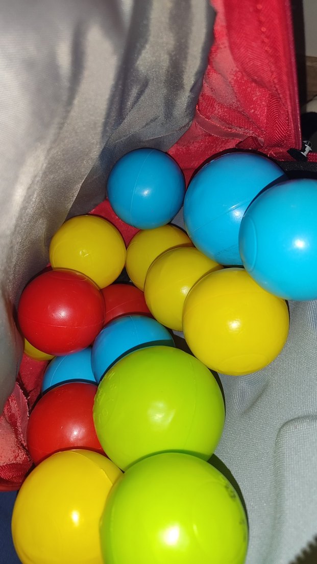 Farklı boyutlarda, kırmızı, sarı, mavi ve yeşil renklerde renkli plastik toplar seti. Oyun ve duyusal aktiviteler için uygundur.
