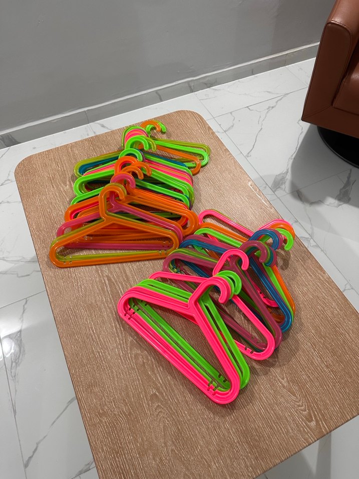 Çeşitli kıyafetler için uygun, dayanıklı ve hafif renkli plastik askılar seti. 40 adet