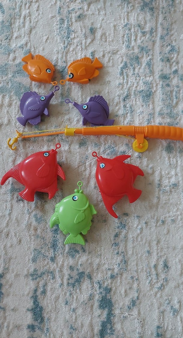 Renkli plastik balıklar ve bir olta içeren su oyuncağı seti. takılma yeri kırık ipi de koptuğu için kendimiz taktik. balıklar sapasağlam sorun yok