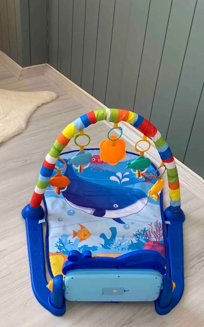 Canlı renklerde plastik bebek oyun matı, asılı oyuncaklarla. Deniz temalı ve yumuşak oyun alanı sağlar.