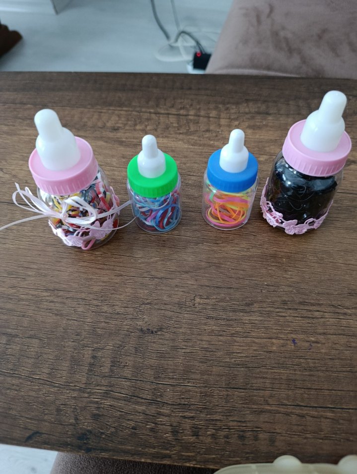 Beyaz emzikli, çeşitli renkli kapaklara sahip, lastik bant ve kurdelelerle süslenmiş renkli plastik biberonlar. 4 adettir