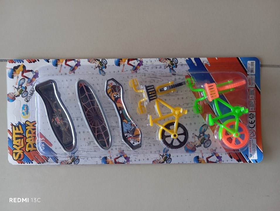 Renkli desenlere sahip, zincir detaylı sarı plastik bisiklet ve baskılı kaykaylar içeren oyuncak seti. Çok renkli ve canlı tasarım