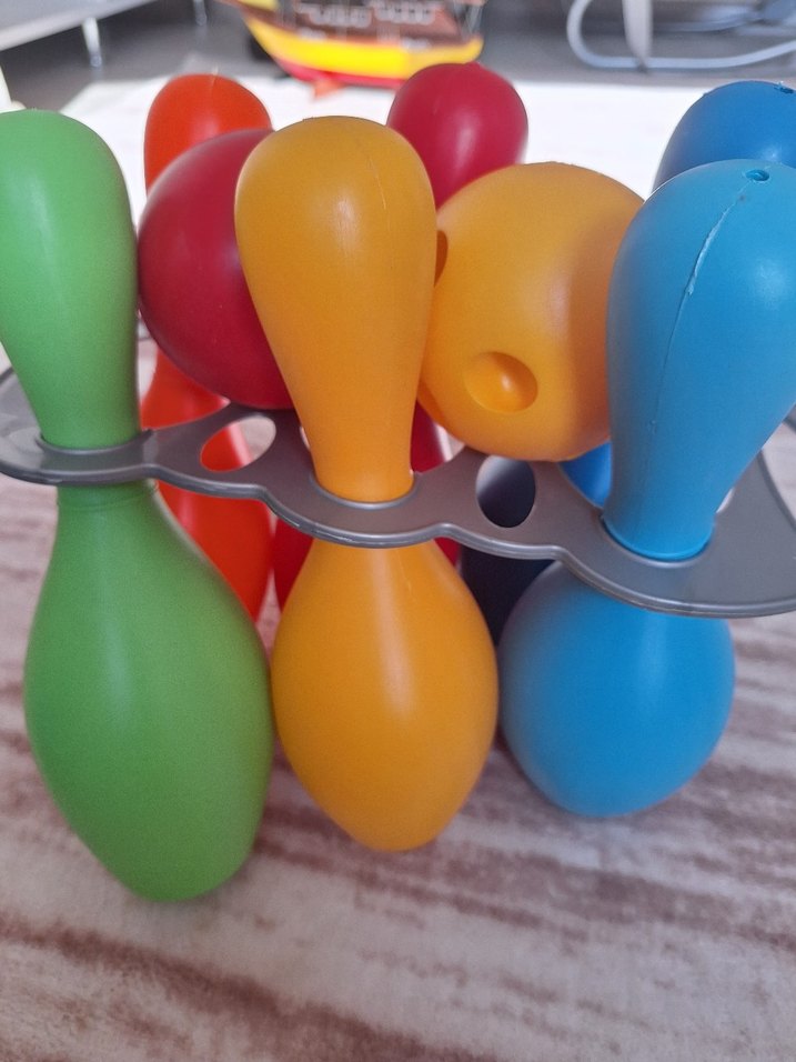 Gri tutucuda düzenlenmiş renkli plastik bowling pinleri seti, iç mekan oyunları için uygundur.