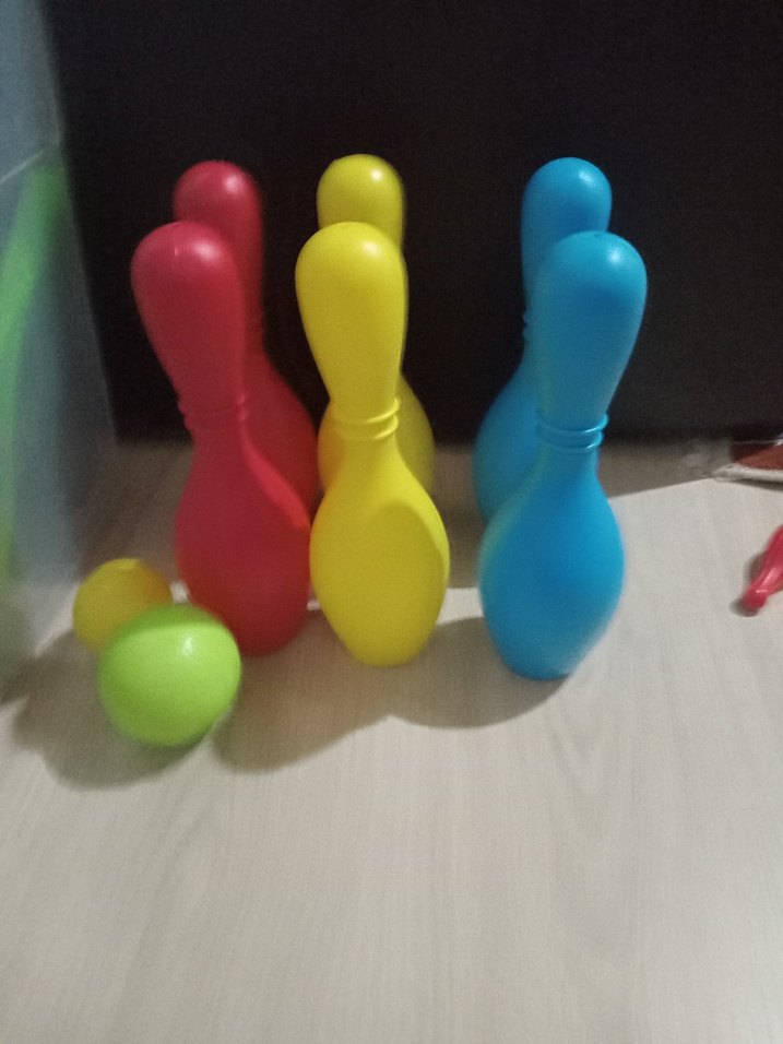Altı adet renkli plastik bowling pimi ve iki top içeren oyun seti.