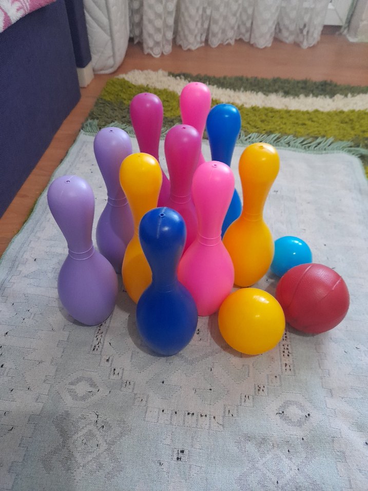 Çeşitli parlak renklerde plastik bowling topları ve pinleri içeren renkli bowling seti.