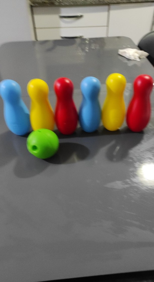 Altı renkli plastik bowling pimi ve yeşil top içeren eğlenceli bir bowling seti .