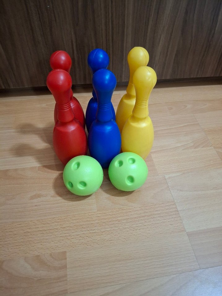 Kırmızı, mavi ve sarı renklerde altı adet plastik bowling pimi ve iki yeşil bowling topu içeren renkli bowling seti.