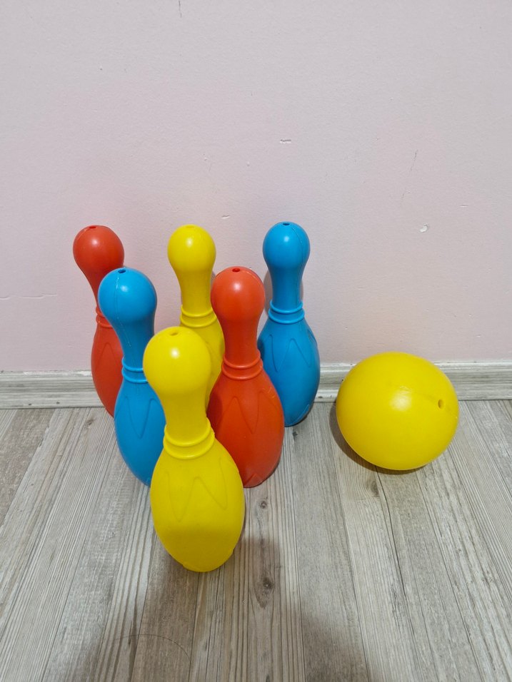 Altı renkli plastik pin ve top içeren renkli bir bowling seti, iç mekan oyunları için uygundur.