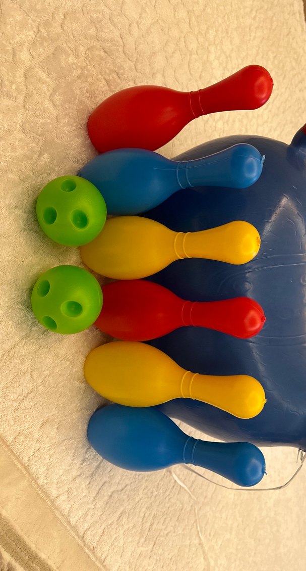 Kırmızı, mavi, sarı ve yeşil renklerde plastik bowling topları ve pimi içeren renkli set.