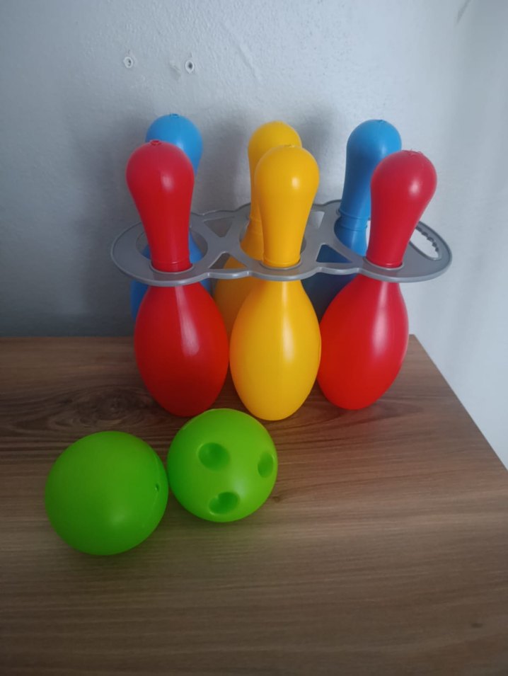 Kırmızı, sarı ve mavi renklerde altı adet plastik bowling pimi ve iki yeşil top içeren renkli set. Hafif ve iç mekan oyunlarına uygun.