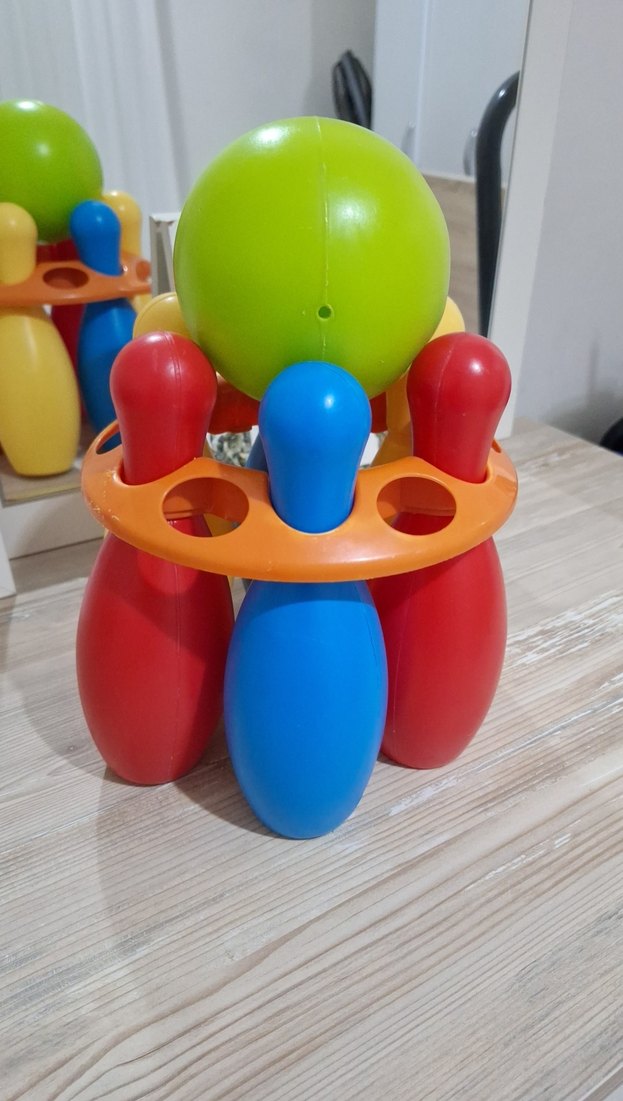 Canlı kırmızı, mavi, yeşil ve turuncu renklerde plastik bowling seti oyuncak. İç mekan oyunları için uygundur.