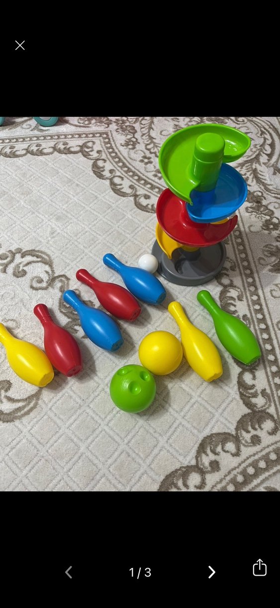 Canlı kırmızı, mavi, sarı ve yeşil renklerde plastik bowling topları ve pinleri içeren renkli bir bowling seti. Arabalar beşik hepsi icnde ayrı almak isterseniz ilan acarm