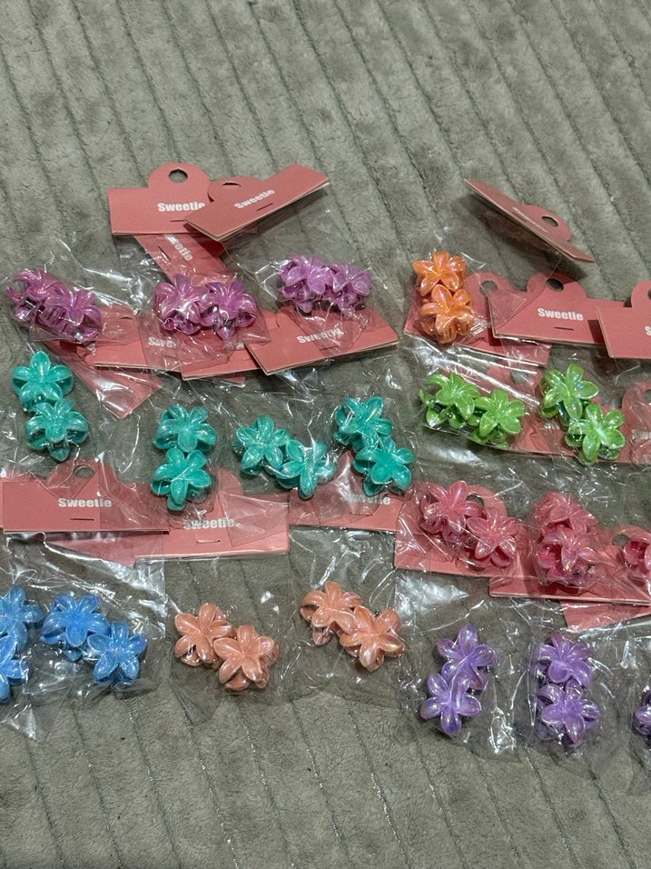 Çiçek şeklinde renkli plastik saç tokaları, bohem ve retro tarzlara uygun.