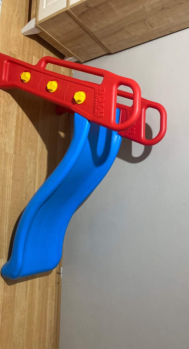 Mavi kaydırma yüzeyi ve kırmızı kulplarıyla renkli plastik çocuk kaydırağı, dayanıklı ve kolay monte edilir.
