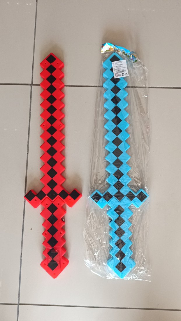 Renkli plastik malzemeden yapılmış, kareli desenli ve Velcro özellikli çocuk kılıcı. ️