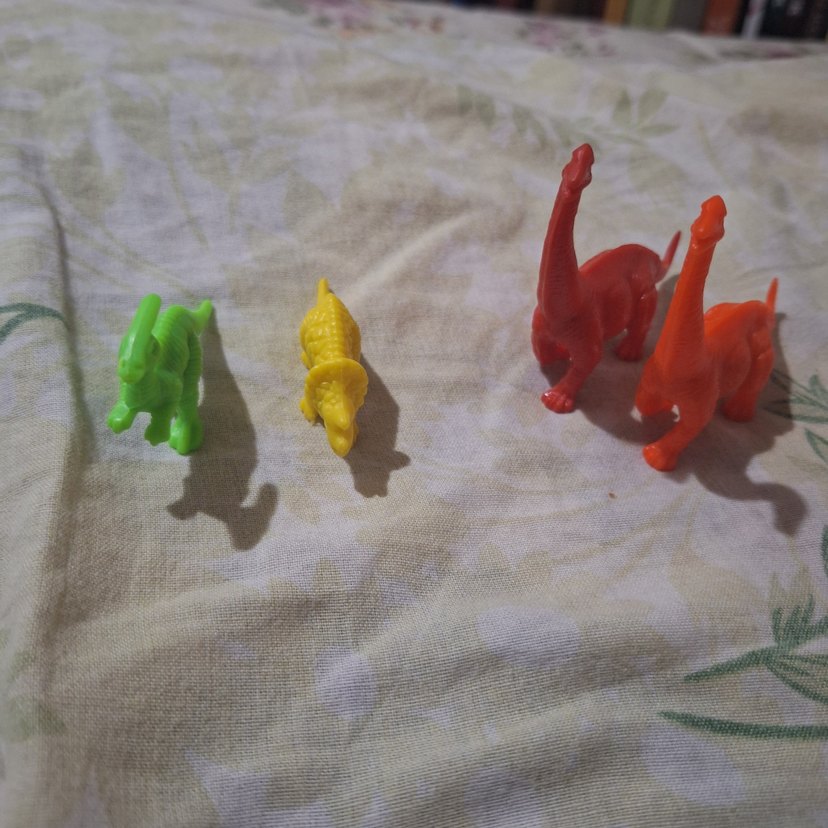 Çeşitli şekillerde ve canlı renklerde renkli plastik dinozor figürleri.