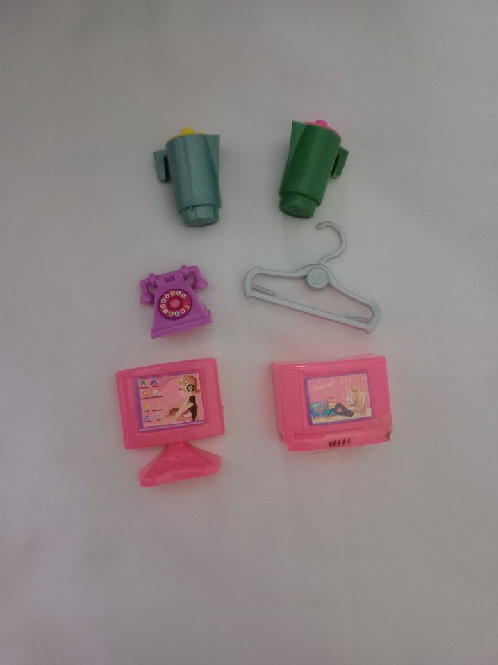 Pembe bilgisayar monitörü, televizyon, askı, telefon ve yeşil ile mavi renkli iki küçük kaptan oluşan renkli mini oyuncak seti. tekli ilan açılır -tekli fiyattır