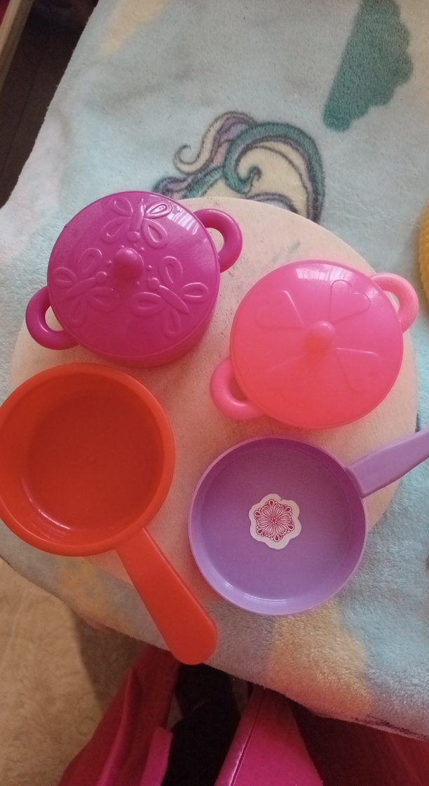 Pembe, mor ve turuncu renklerde, kulplu plastik mini tencere ve tavalar. Oyun için uygun, kolay tutulur.