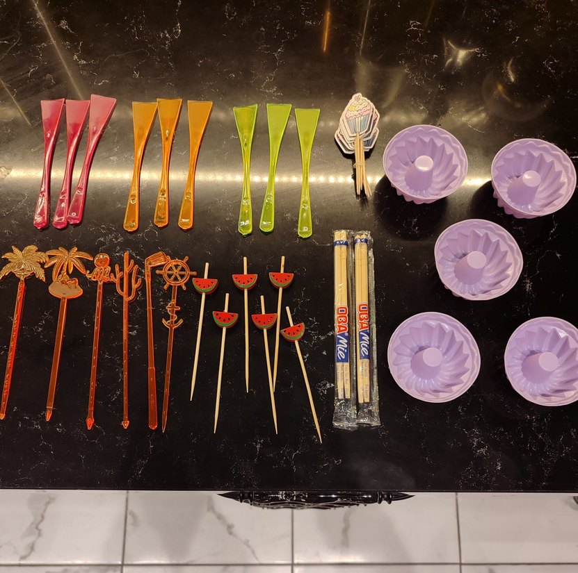 Renkli plastik kaşıklar, süslemeli kürdanlar ve pişirme için silikon kek kalıpları içeren mutfak araçları seti. Sadece kek kalıpları kullanıldı