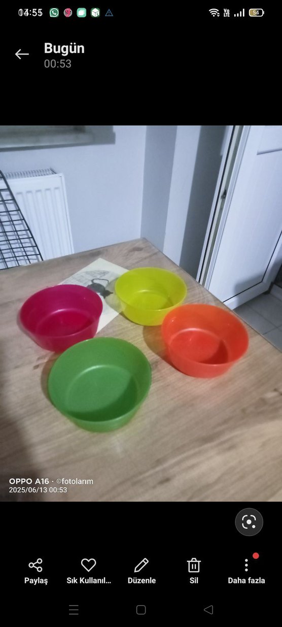 Yeşil, sarı, turuncu ve pembe renklerde 4'lü plastik mutfak kaseleri seti. Hafif ve kullanışlıdır. ️